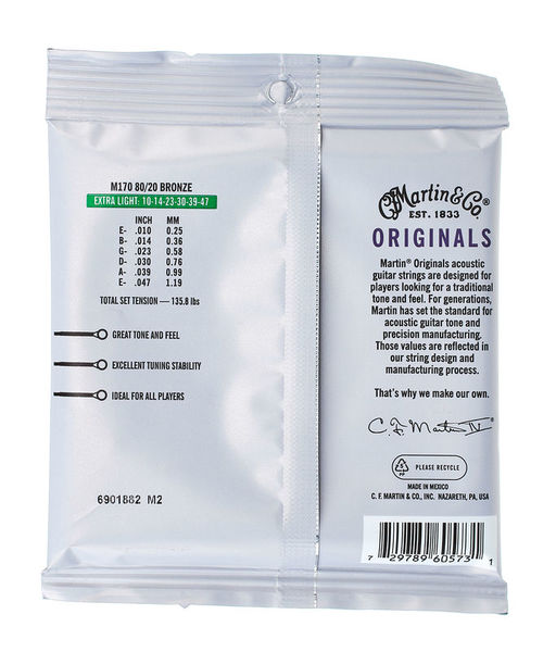 Martin Guitars M170 The Originals; string set for acoustic steel guitar; material 80/20 Bronze; gauges .010, .014, .023, .030, .039, .047