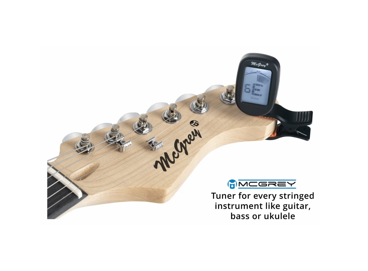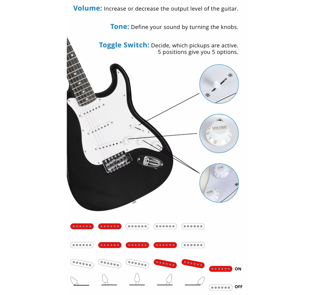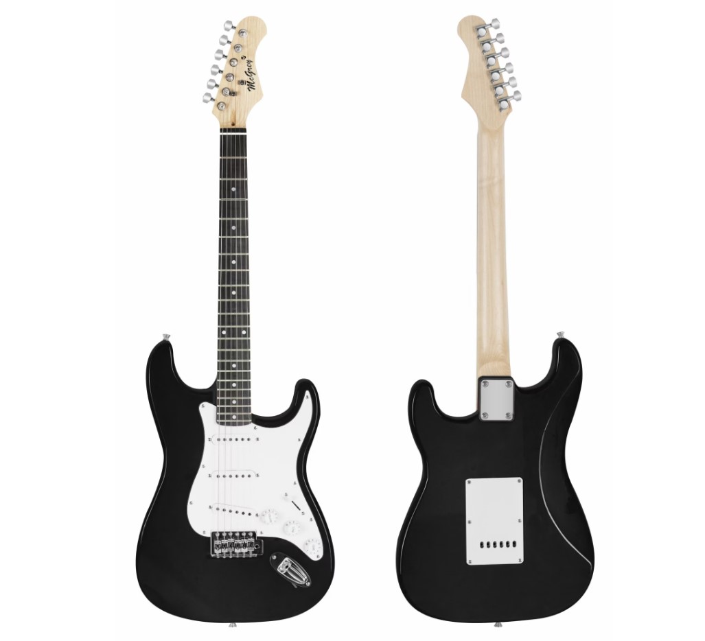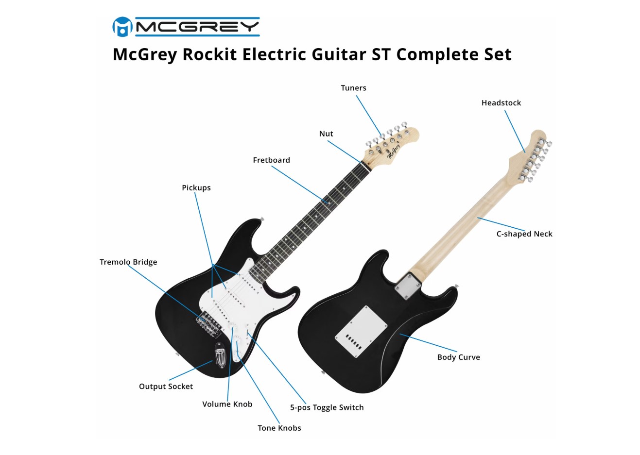 Set chitară electrică McGrey Rockit Guitar ST-Complete Black 00041433 cu accesorii incluse: tuner, husă chitară, cablu, strap, set corzi de rezervă și pene