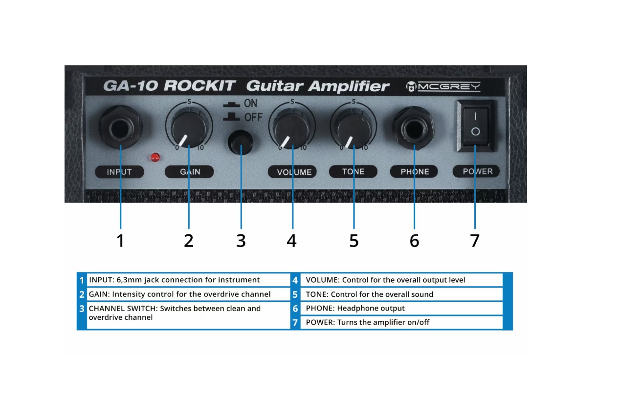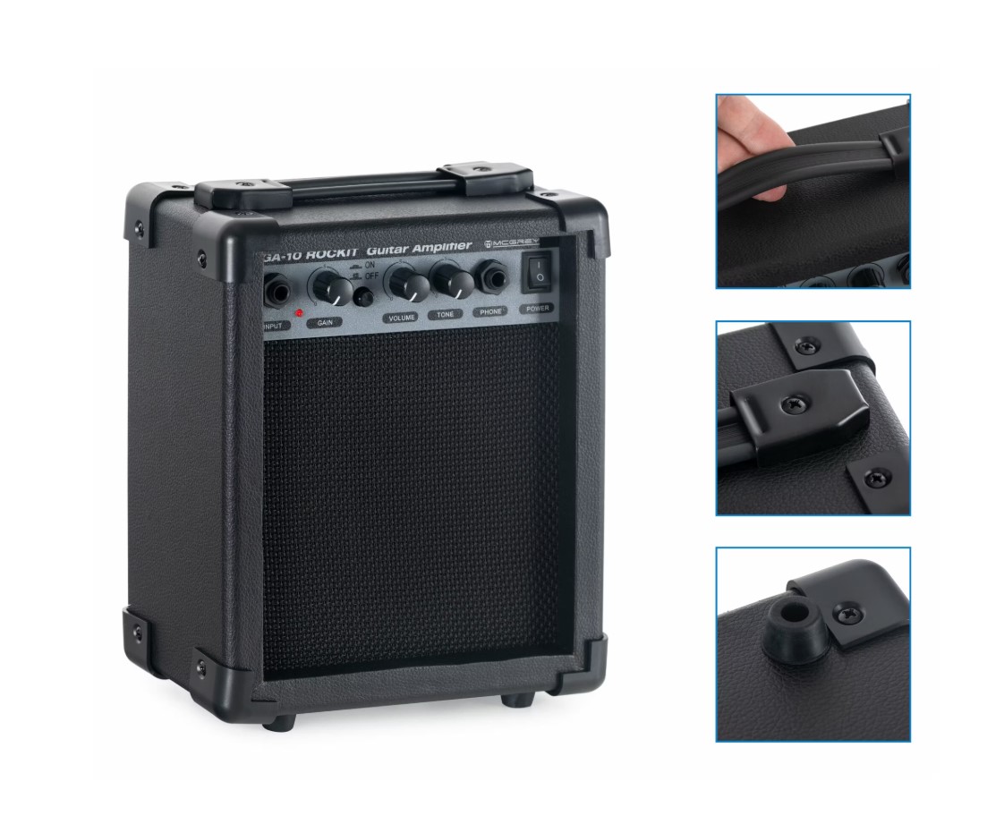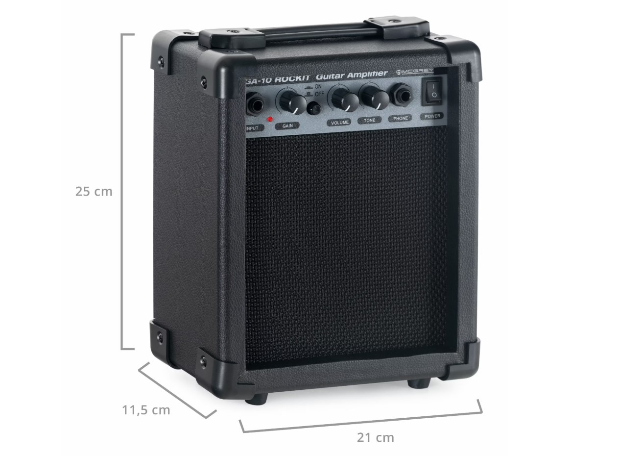 - Amplificator de chitară de 10 W (RMS) cu mufă pentru căști și distors