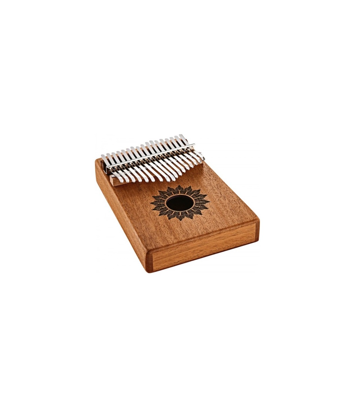 Kalimba Meinl KL1708H Mahogany confecționată din mahon de înaltă calitate, cu un finisaj mat. Gaura de rezonanță tradițională produce tonuri mai calde și sustain mai lung