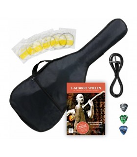 - Accesorii incluse: husă pentru chitară electrică, cablu de 2.5 m lungime pentru chitară, 3 pene, 1 set de corzi de rezervă, manual de învățare (limba germană) cu CD audio cu 38 de exerciții și melodii și DVD cu lecții, plus link de download pentru toate videoclipurile pentru studiu la calitate HD