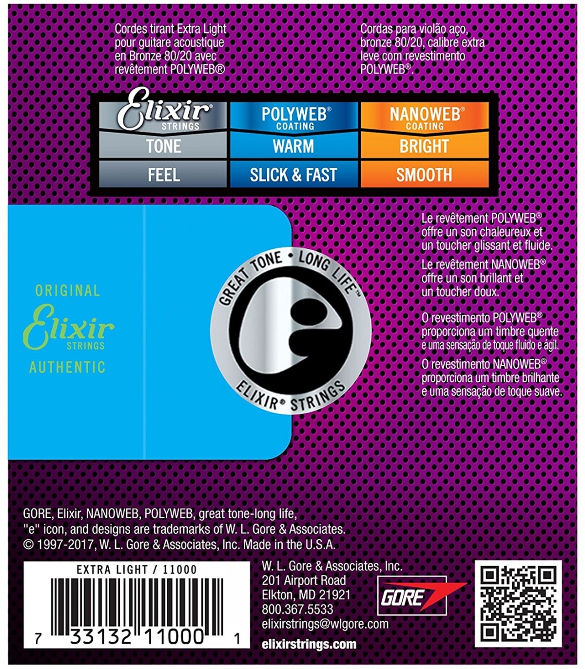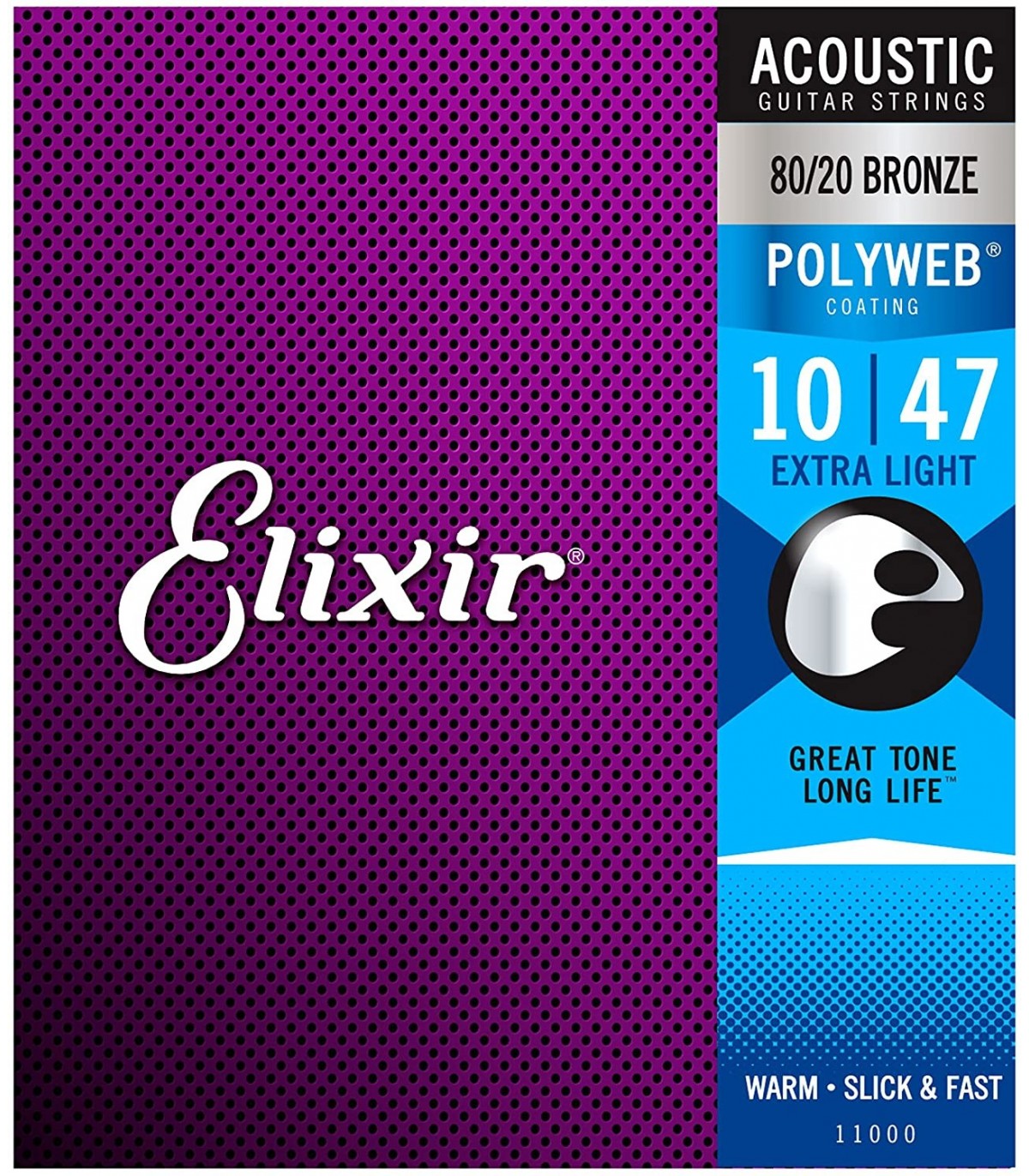 Струны для акустической гитары Elixir Polyweb 80/20 Bronze Extra Легкие, темный характер, теплые, гладкие на ощупь, быстрые, сплав бронзы 80/20, защитный слой Polyweb от коррозии, продлевает срок службы струн, толщина 010-047.