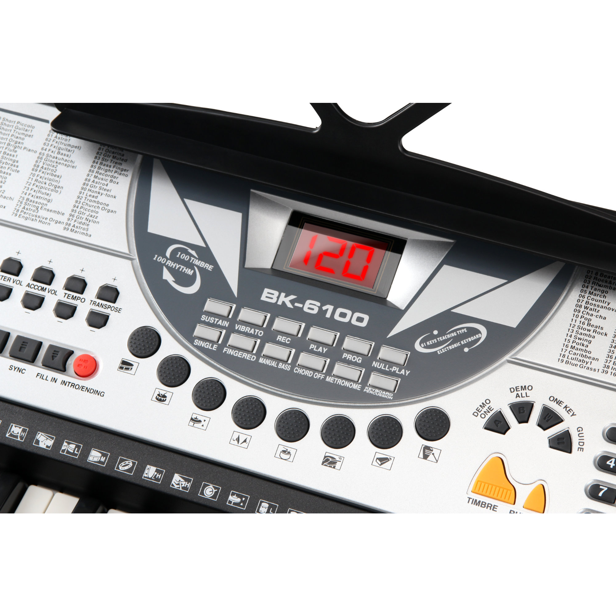 61 клавиша, светодиодный дисплей, 100 тембров, 100 ритмов, 8 демо-песен