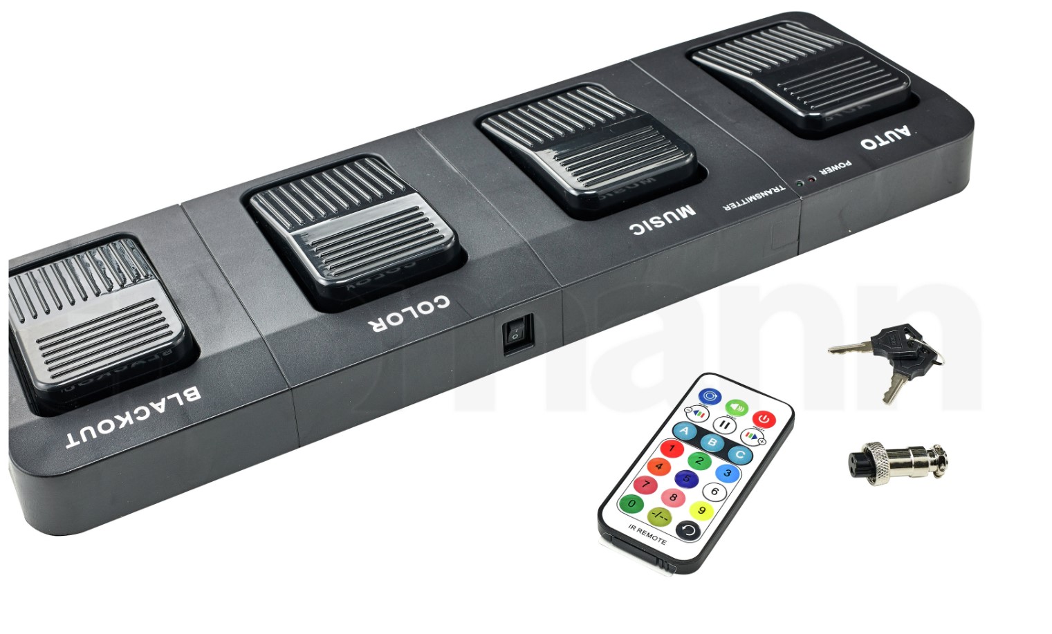 - control: DMX (3/5/10/28 canale), programe automate, sound, master / slave, telecomanda de picior, telecomanda infa-rosu sau pe butoanele de acces in meniu